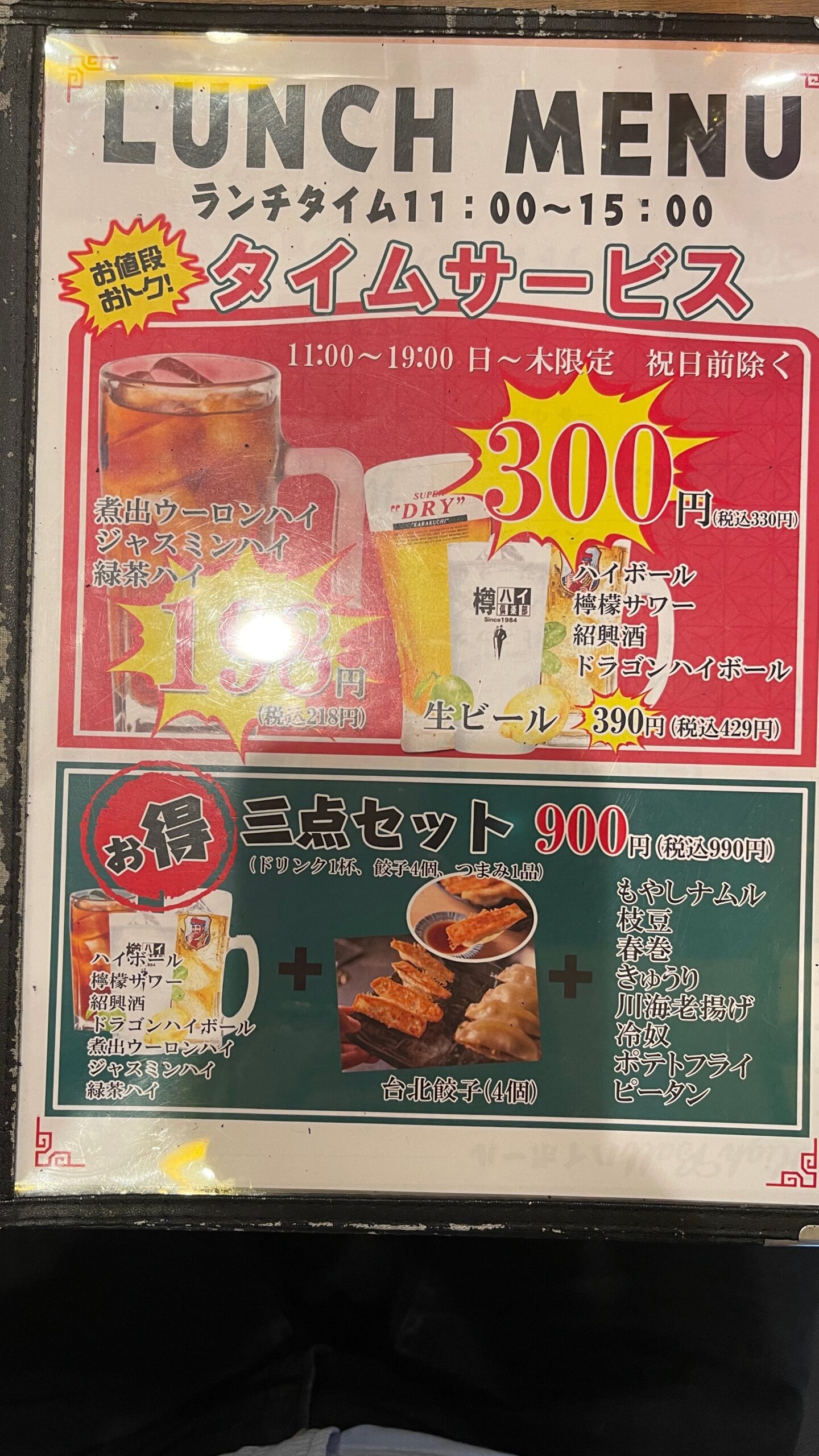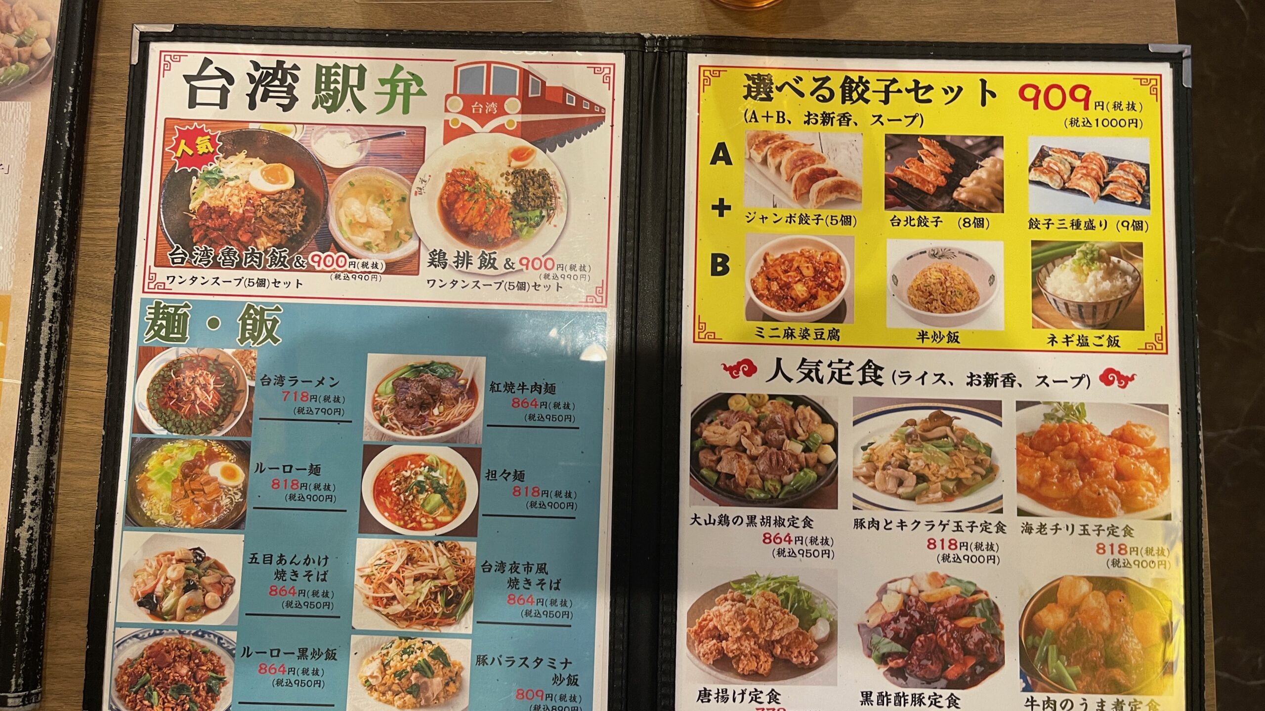 ランチメニューは餃子(ジャンボ餃子5個か、台北餃子8個か、餃子3種9個か)と