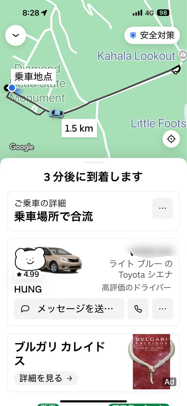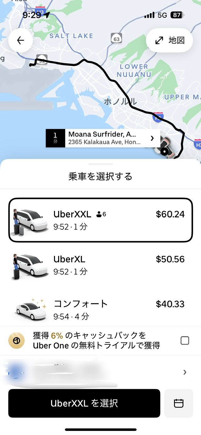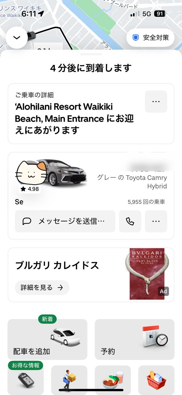 もう一つ、ワイキキのホテルから空港までUberアプリを開いた時の画面はこちら↓